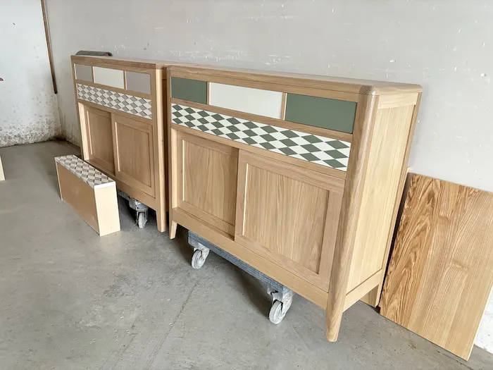 Finition : teinte brute mate, peintures « vert olive » et « ivoire ».