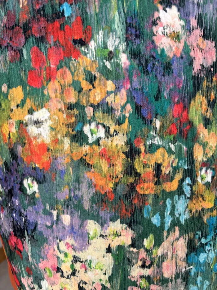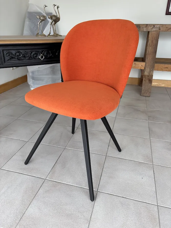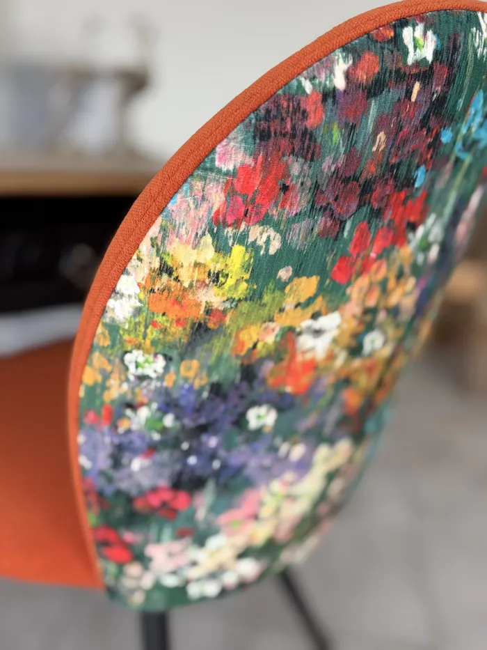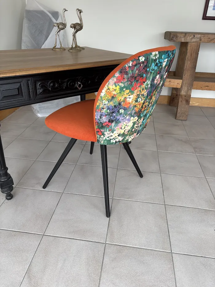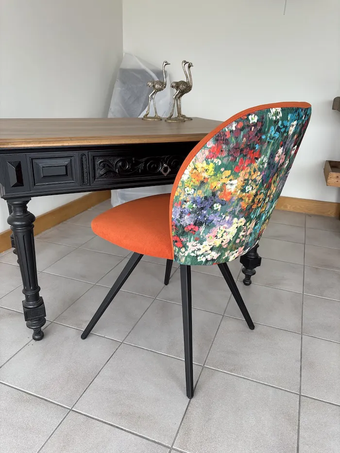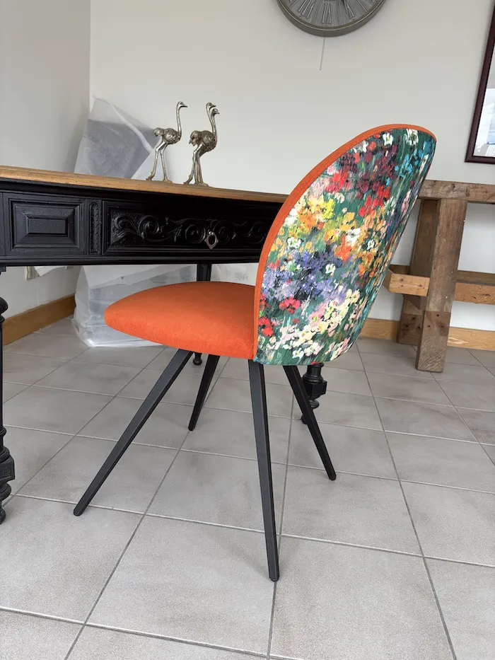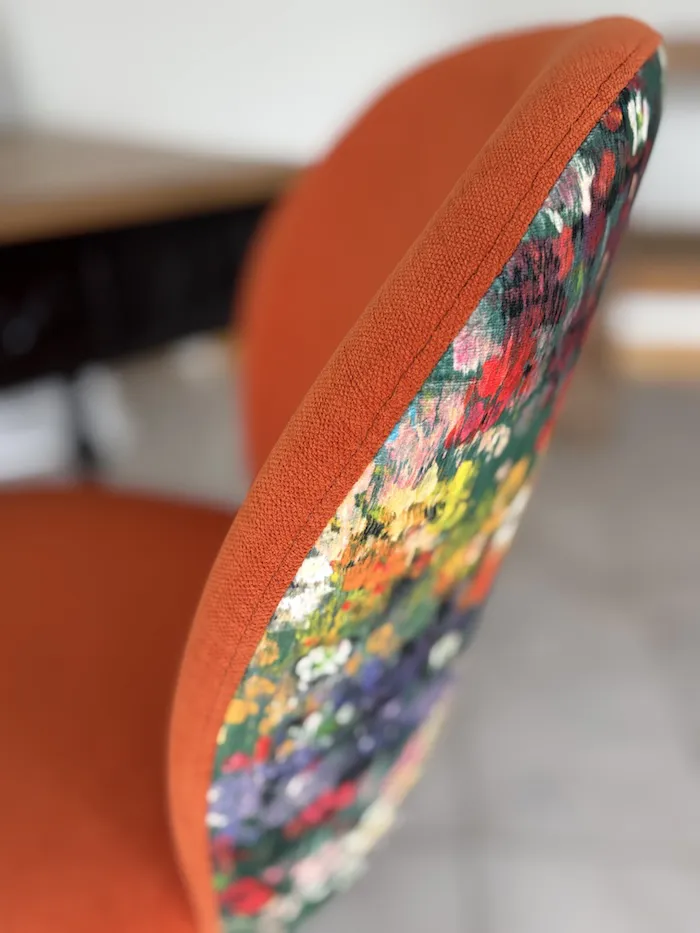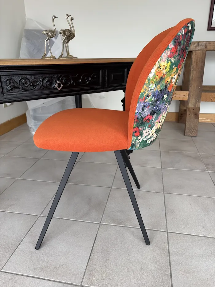 Le modèle est présenté avec les tissus Mystic 28 orange et Morisot 08