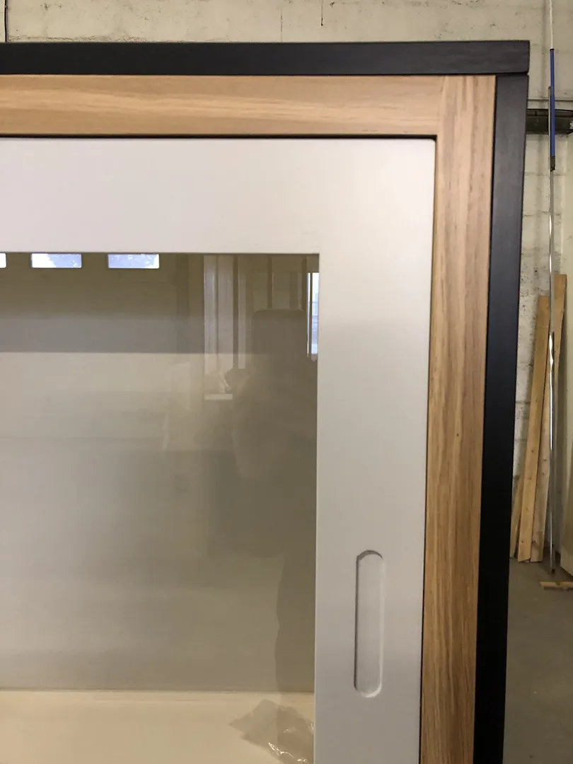 Finition verre non sablé, peintures « télégris » et « gris terre d’ombre » mates, teinte brute mate sur carcasse, non vieilli.