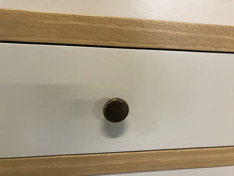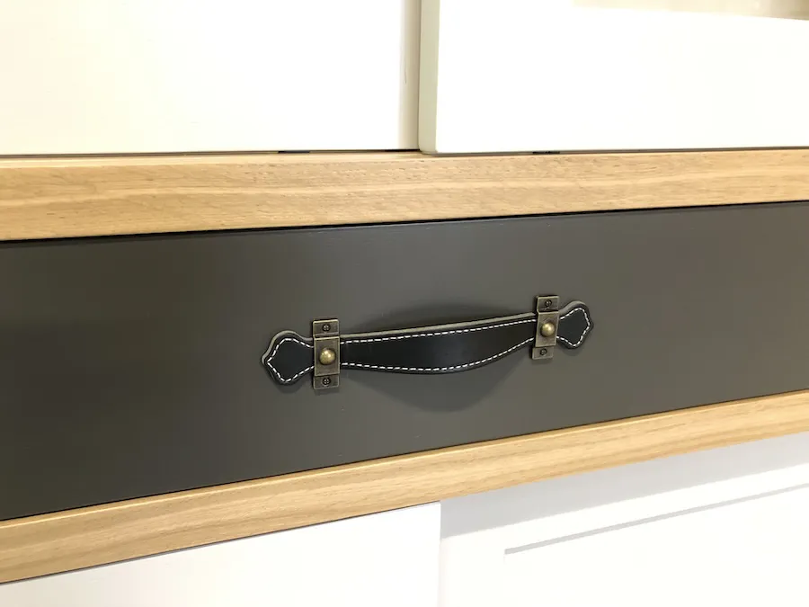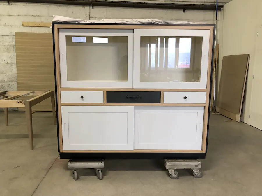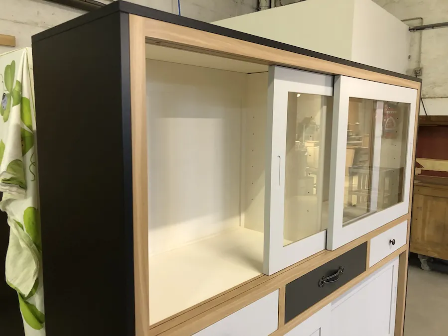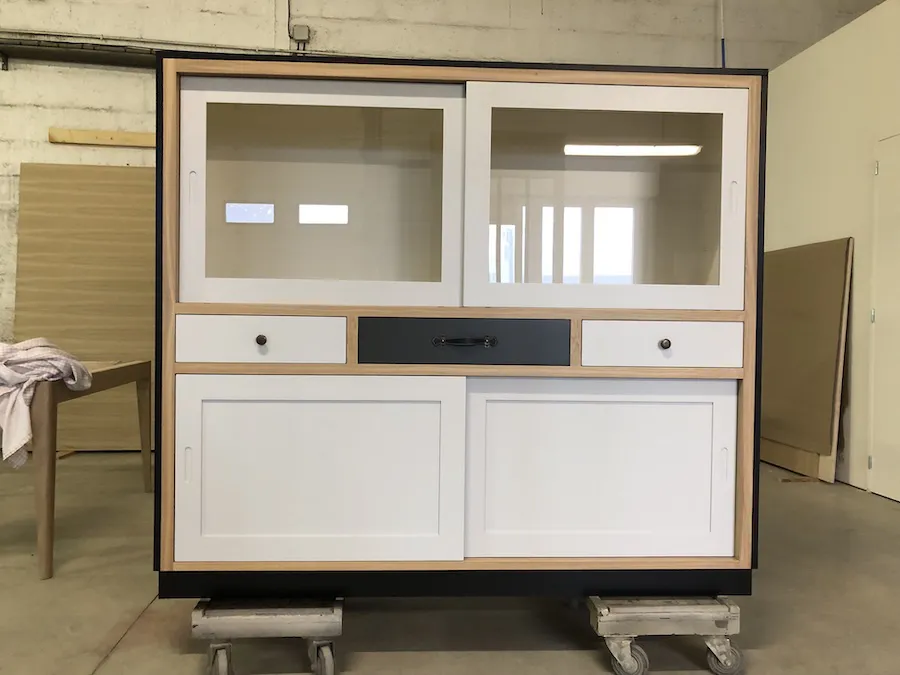 Chêne massif français (côtés en médium plaqué recouvert de peinture grise terre d’ombre)