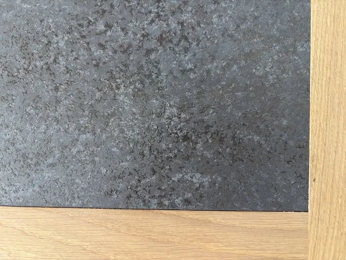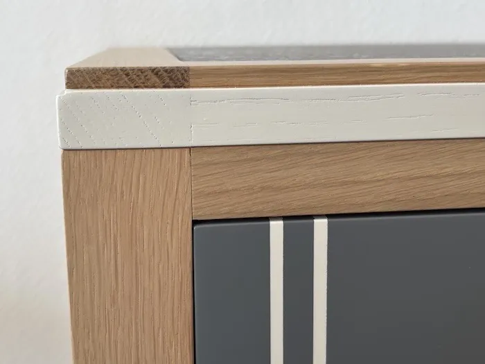Finitions : teinte brute mate non vieillie, peinture gris moyen et filet ivoire.
