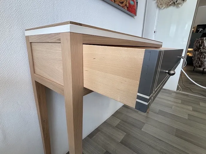 Tiroir à queue d’aronde, assemblage tenon, mortaise et cheville. Conception résistante.