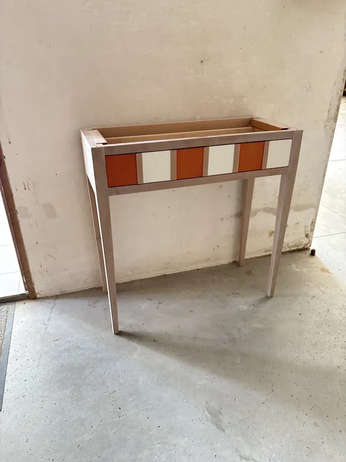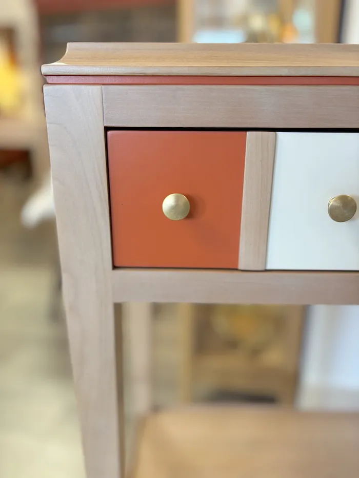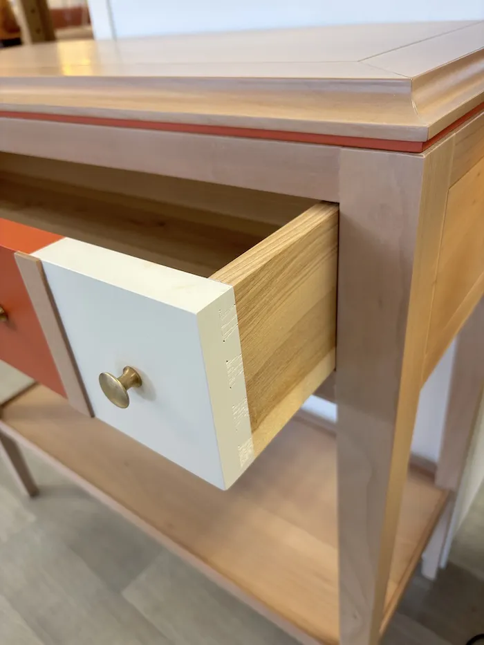 Finitions : teinte brute mate sur le plateau et la carcasse, tiroirs et liseré peints en terracotta et ivoire mates.