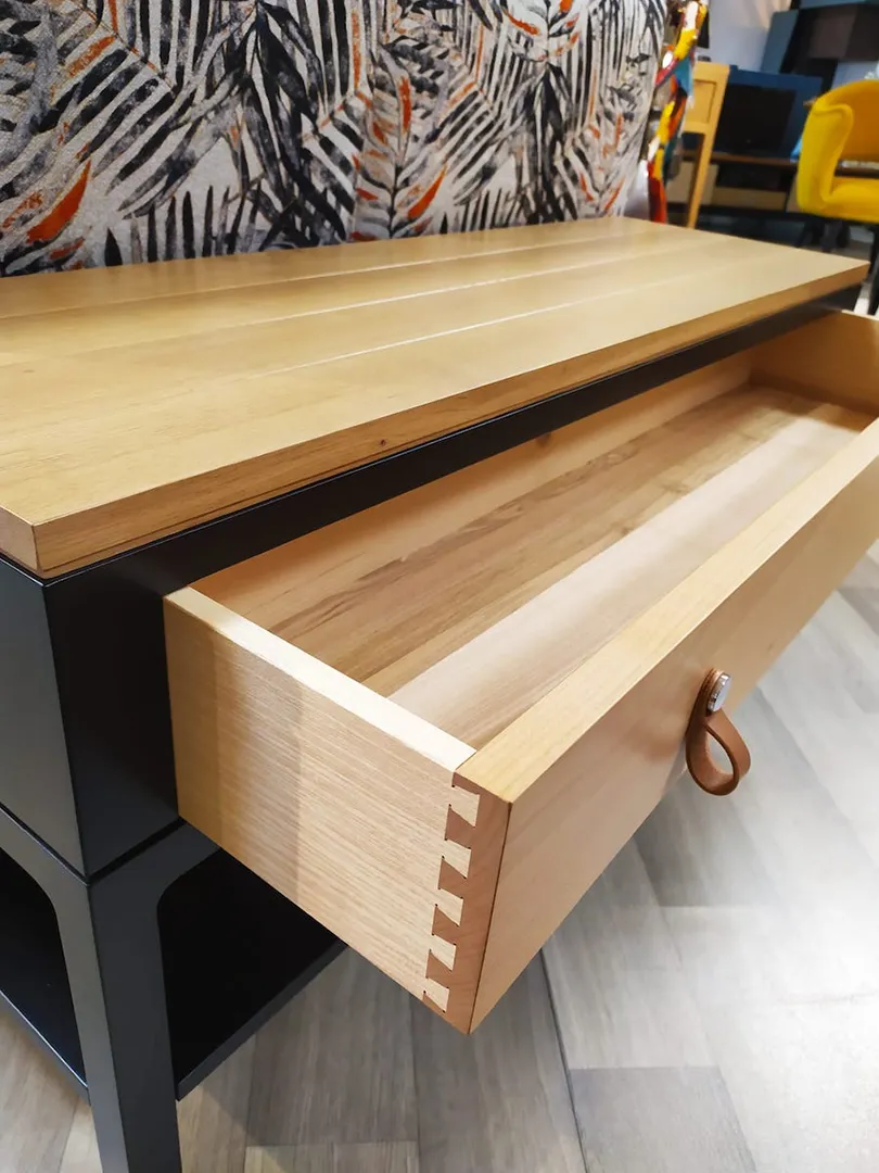 Tiroir à queue d’aronde, assemblage tenon, mortaise et cheville. Conception résistante.