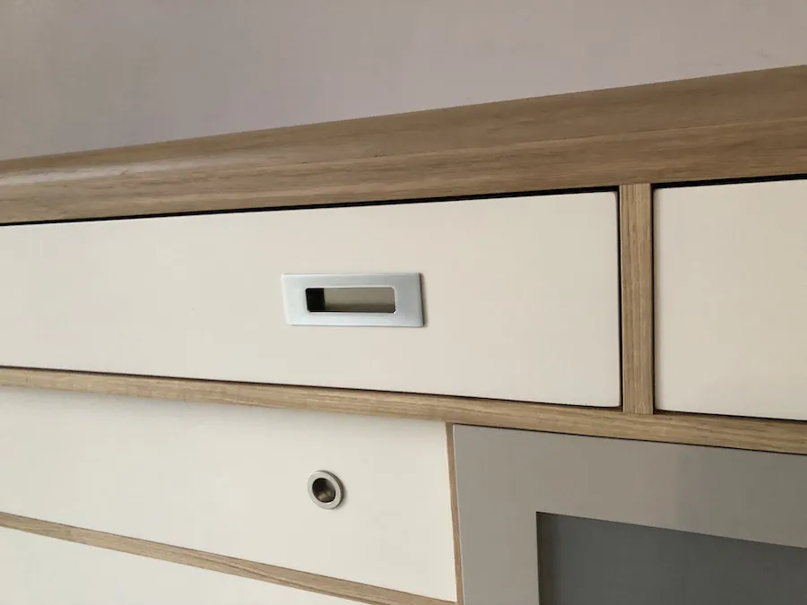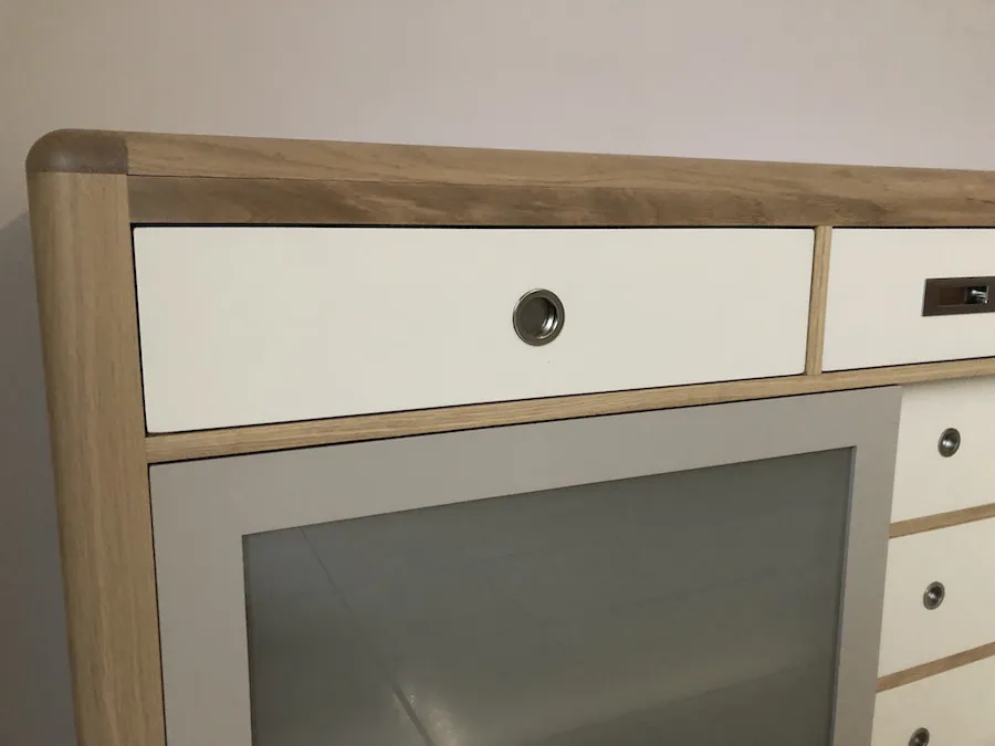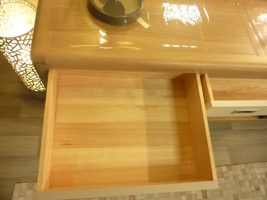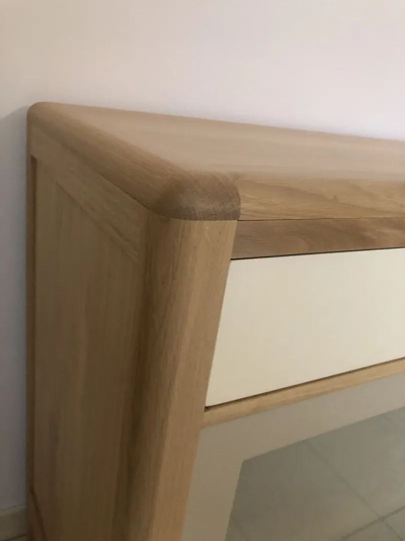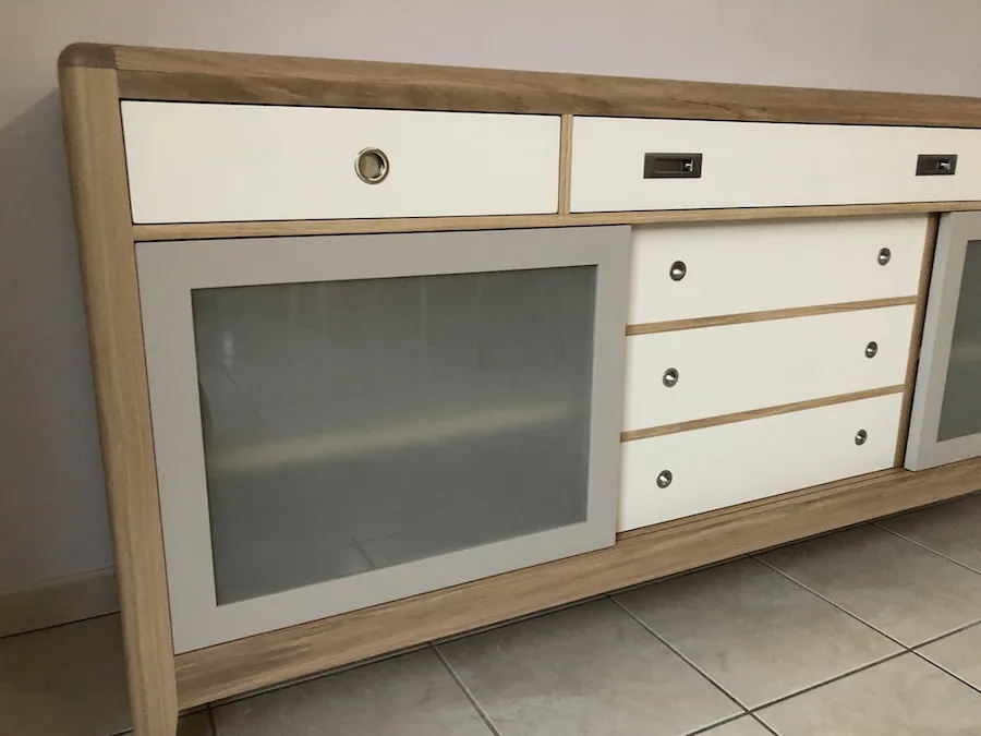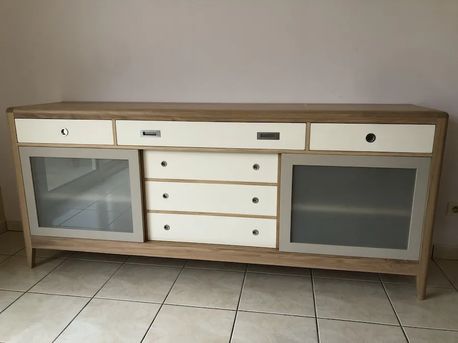 Les éléments extérieurs sont en chêne massif français, les éléments intérieurs, arrière et fonds, en bois massifs divers du pays (châtaigner, frêne, hêtre, …)