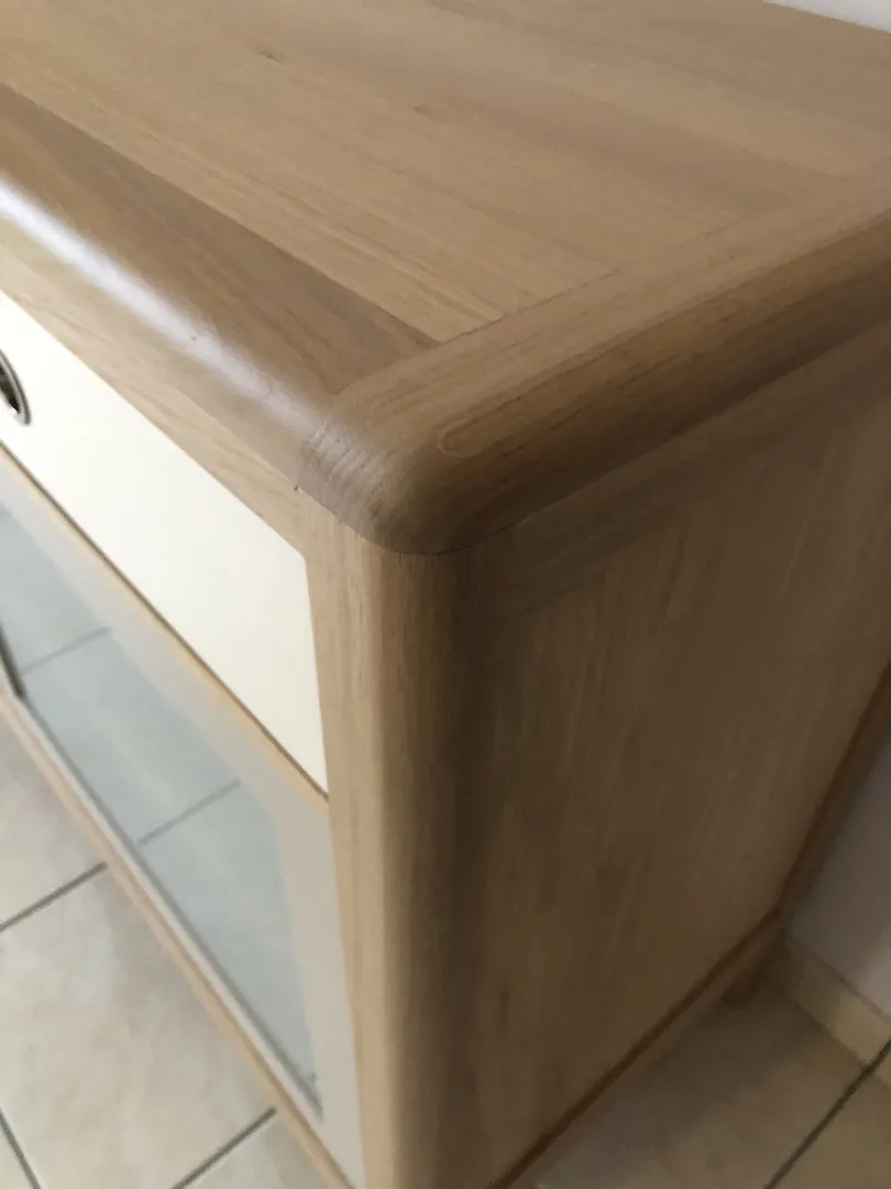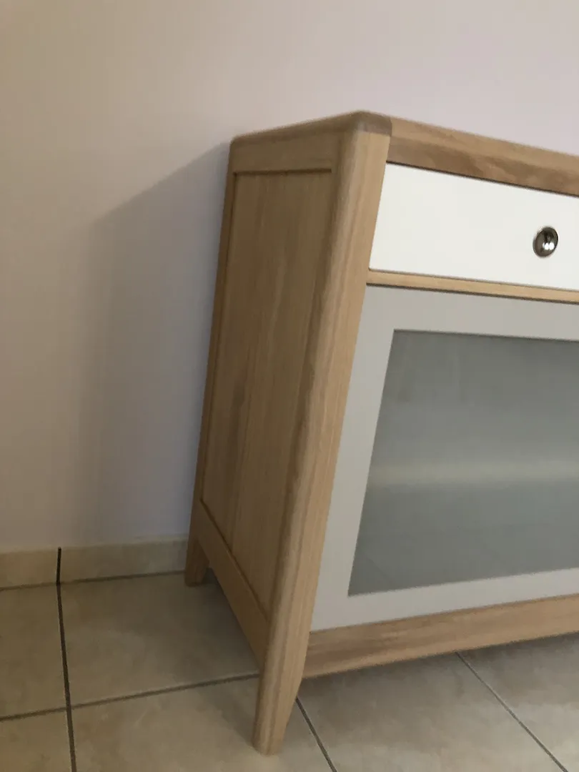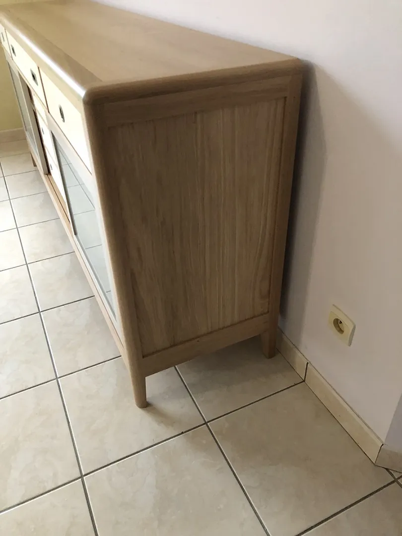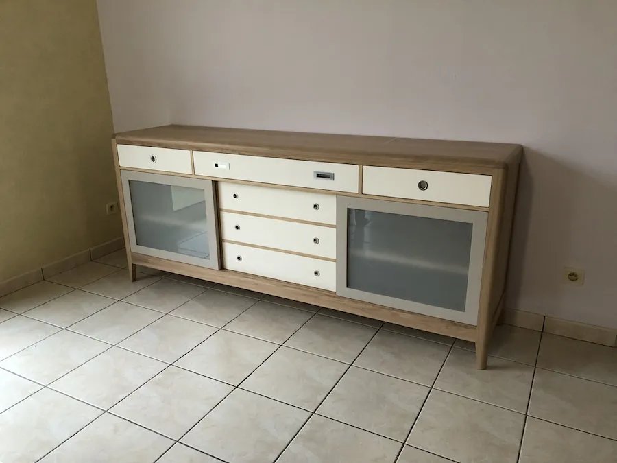 Enfilade 3 portes coulissantes (dont 1 apparence 3 tiroirs), 3 tiroirs. 3 étagères (1 dans chaque partie) réglables sur crémaillère.