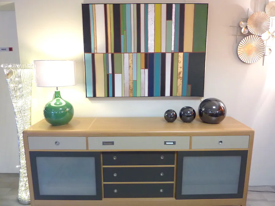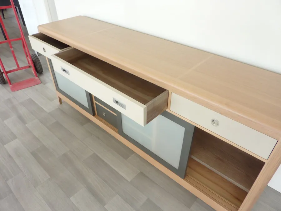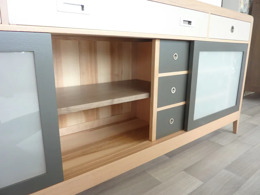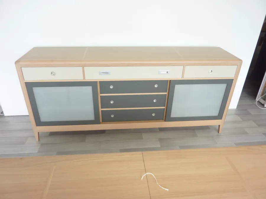 Enfilade 3 portes coulissantes (dont 1 apparence 3 tiroirs), 3 tiroirs. 3 étagères (1 dans chaque partie) réglables sur crémaillère.