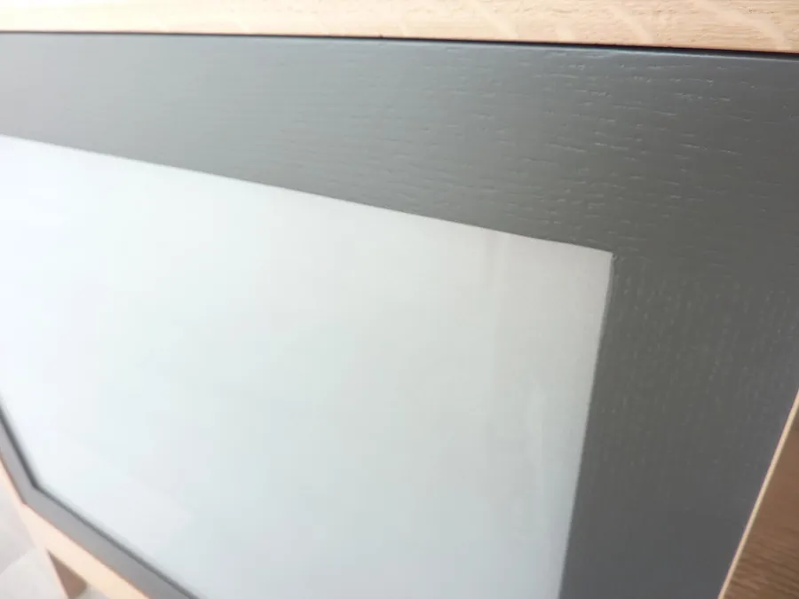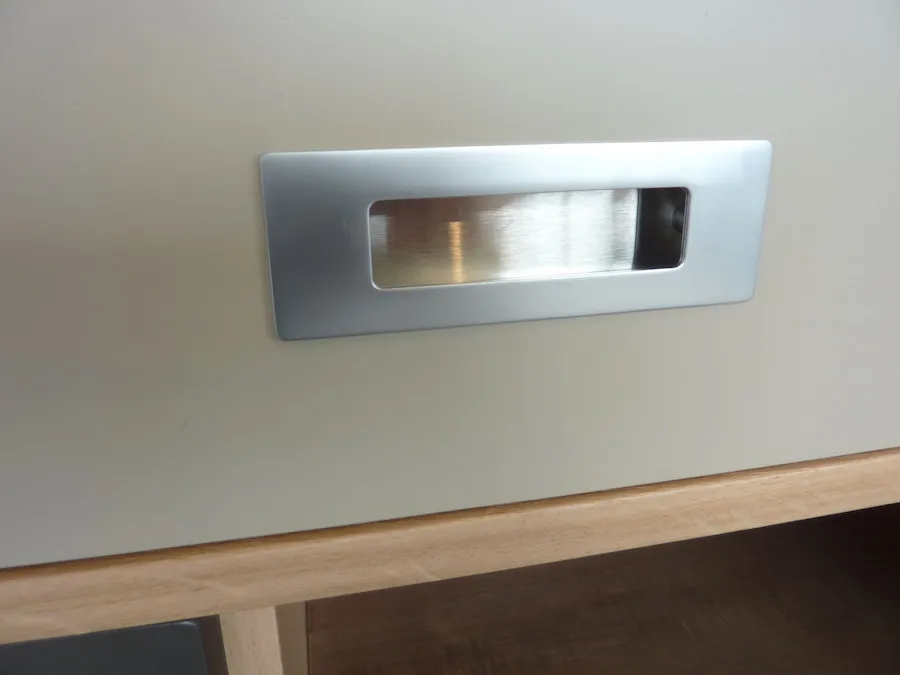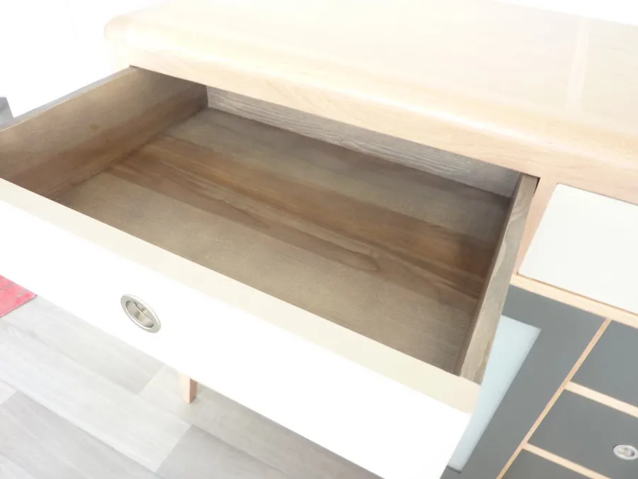 Finitions: teinte brute mate, peinte en « gris terreux » sur tiroirs, « gris terre d’ombre » sur la porte.