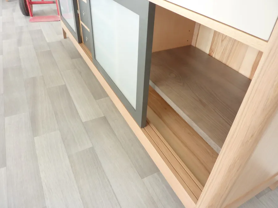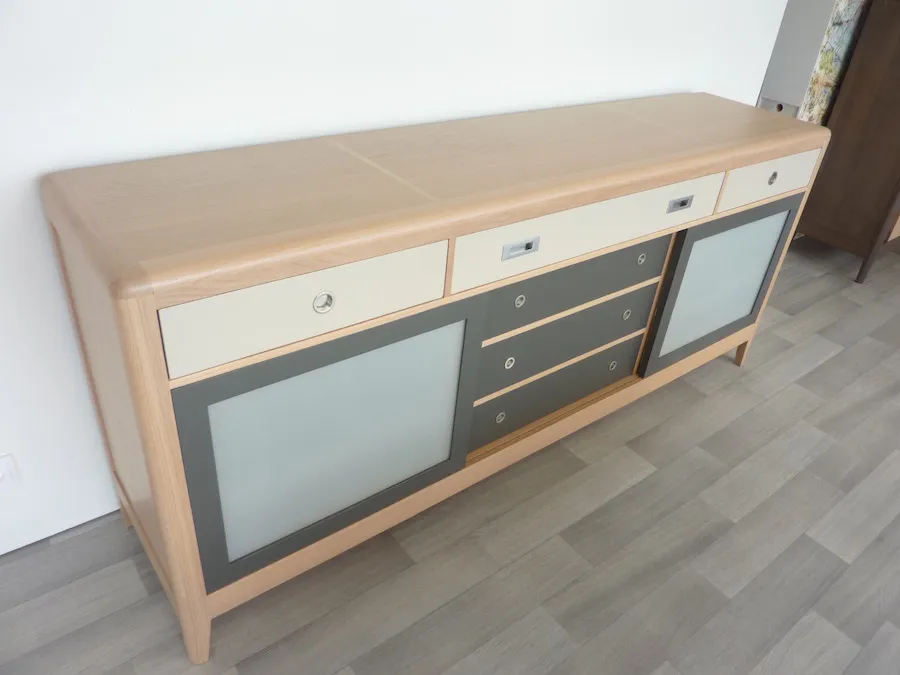 Les éléments extérieurs sont en chêne massif français, les éléments intérieurs, arrière et fonds, en bois massifs divers du pays (châtaigner, frêne, hêtre, …)