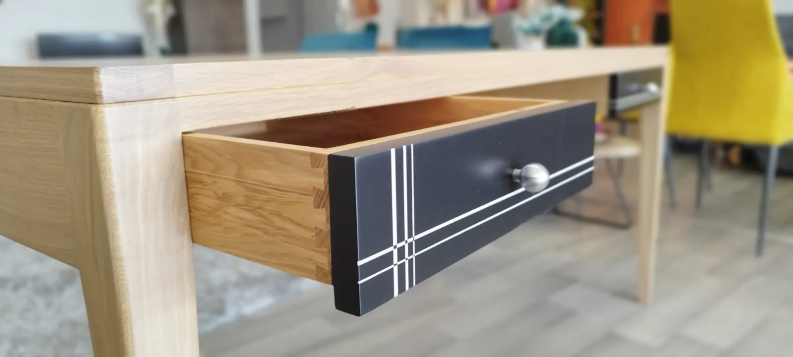 Tiroirs à queue d’aronde, assemblage tenon, mortaise et cheville. Conception résistante.
