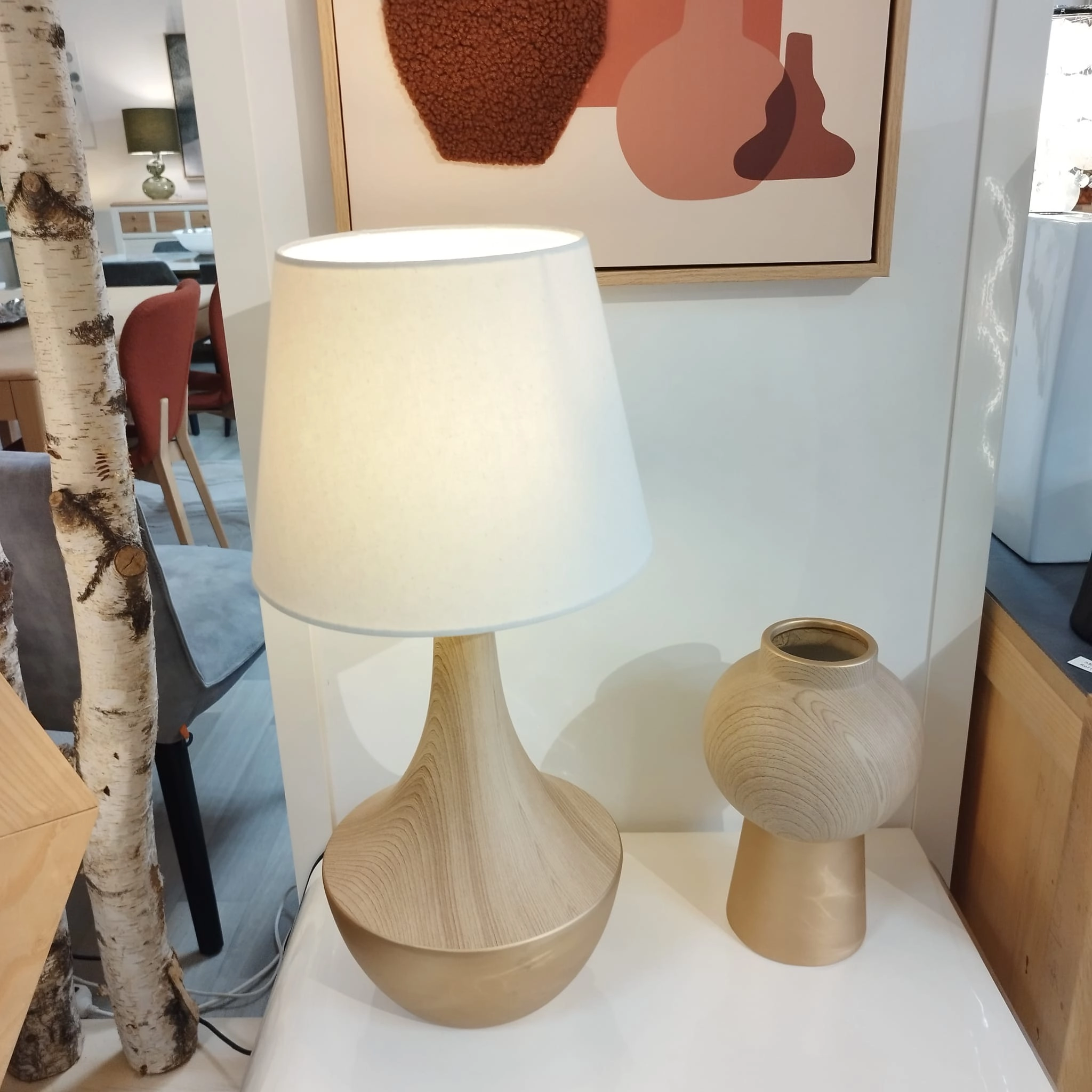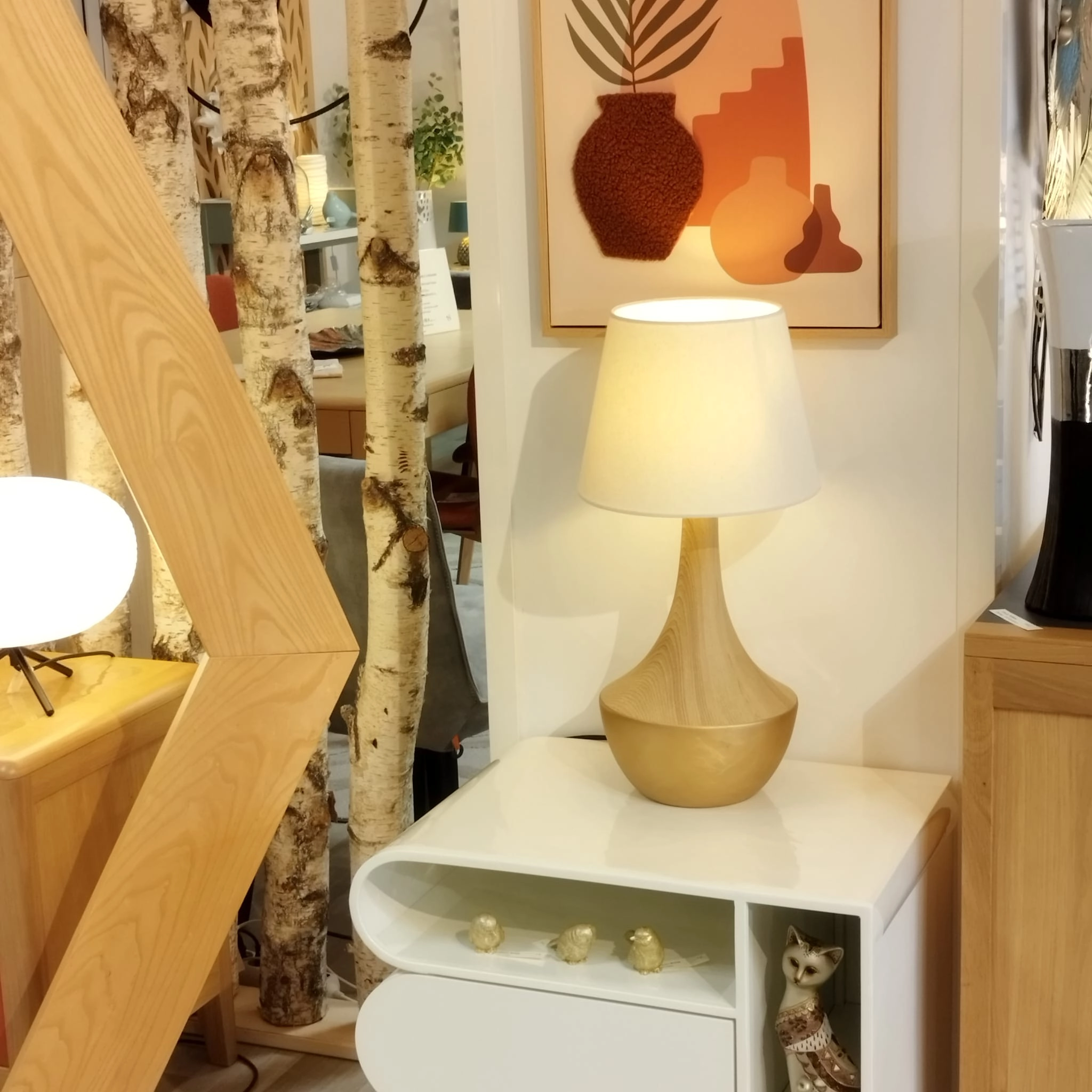 Une lampe en céramique bois et dorée.