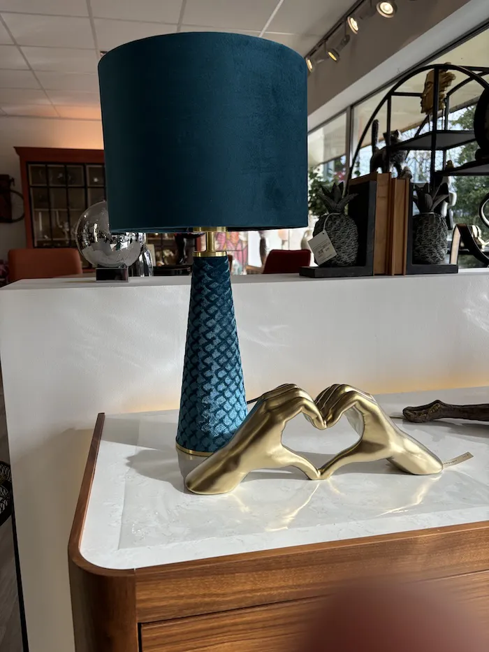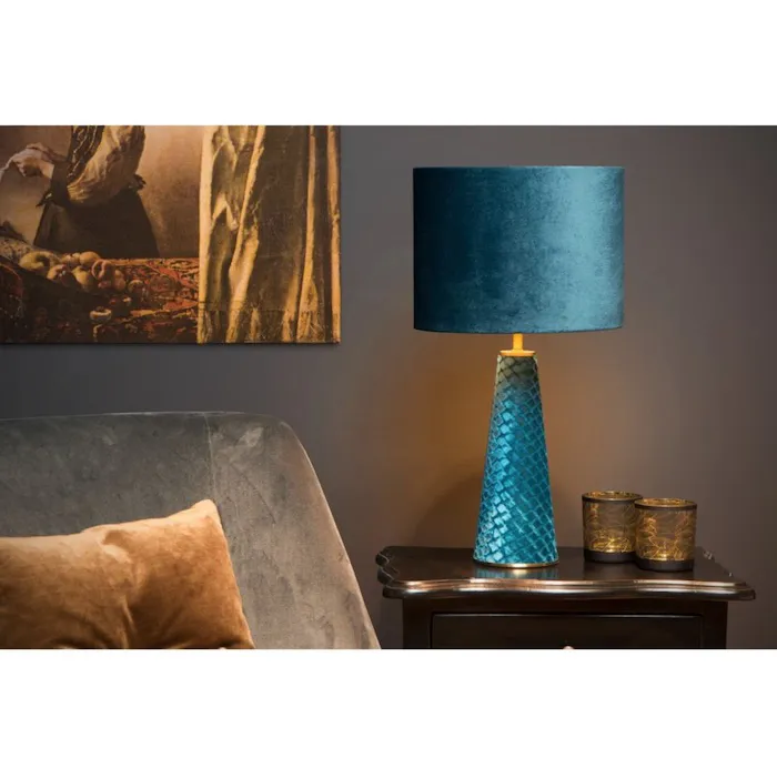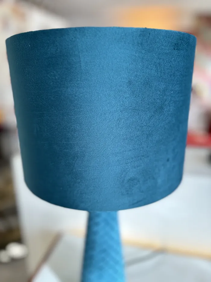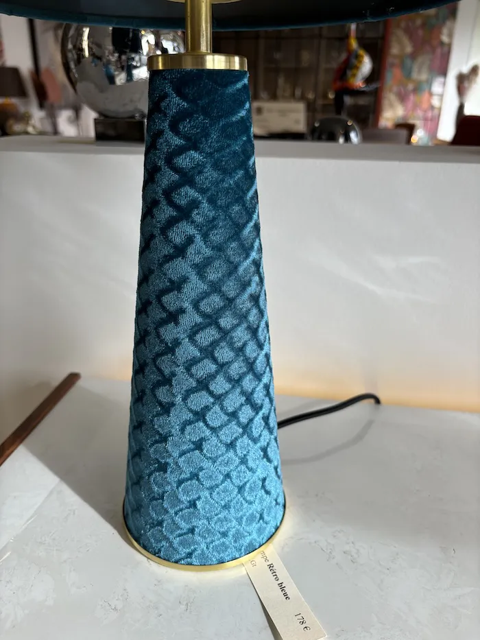 Quelle couleur ! Lampe originale : pied et abat-jour en velours bleu ! … Il n’y en a qu’une !