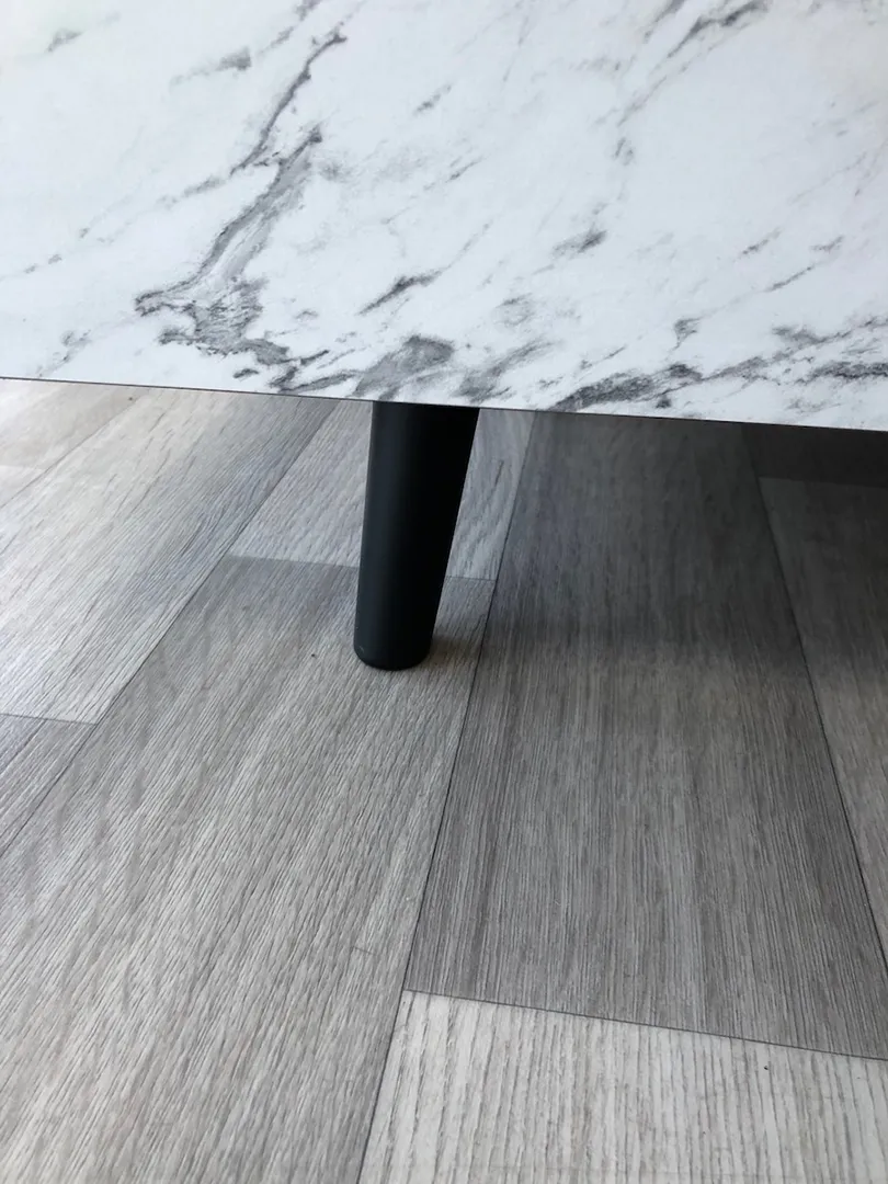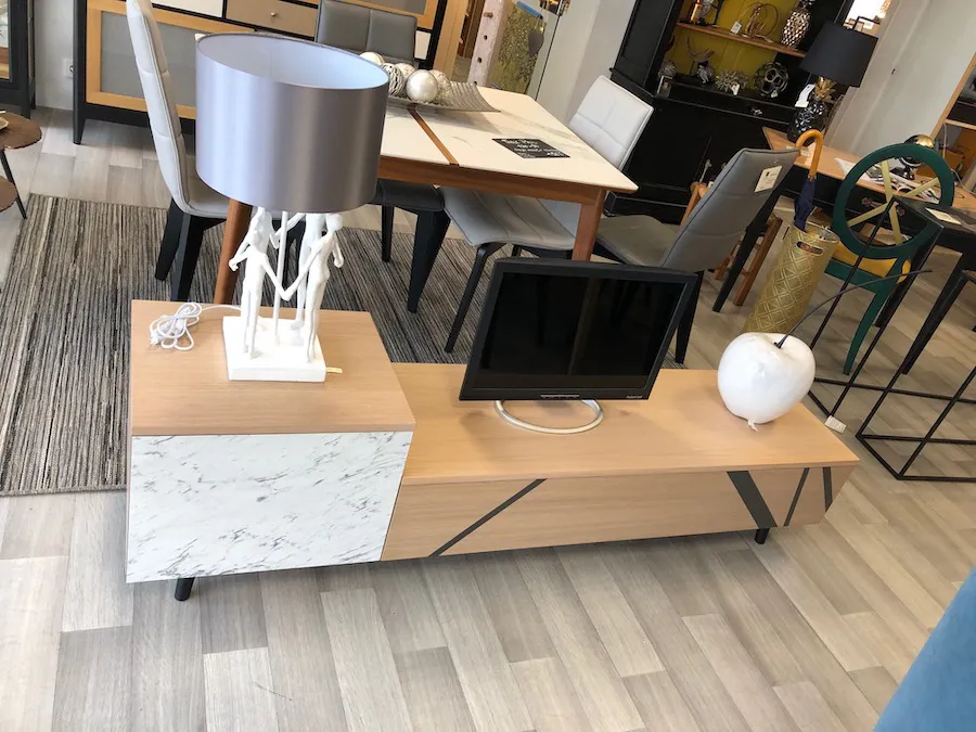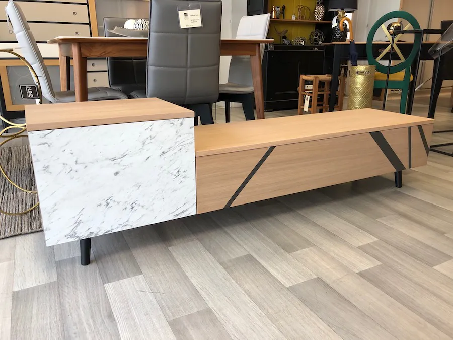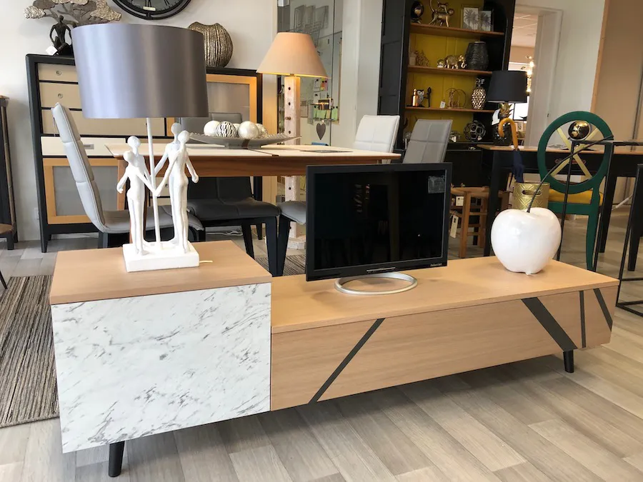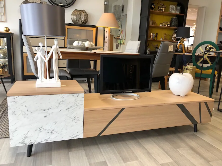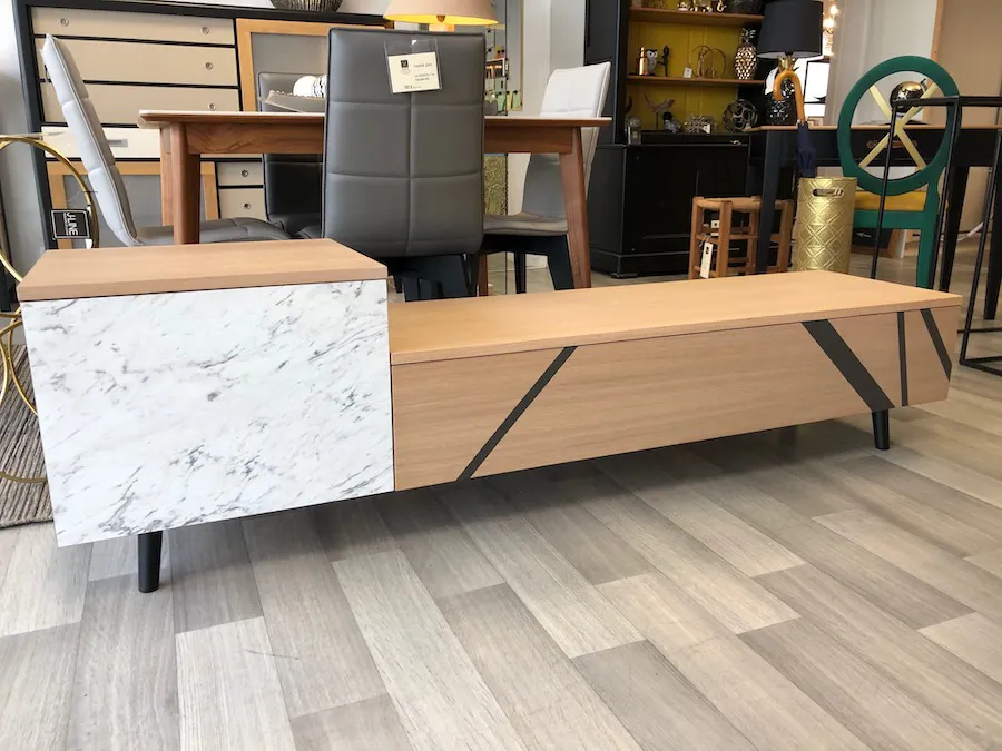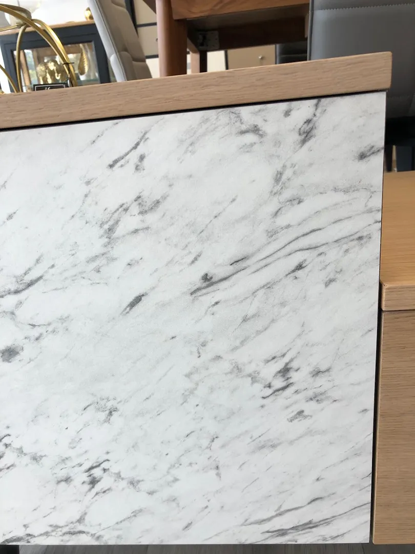 Finitions : « Focus » en « gris terre d’ombre » sur teinte brute mate. Plaqué effet marbre sur la porte (au choix)