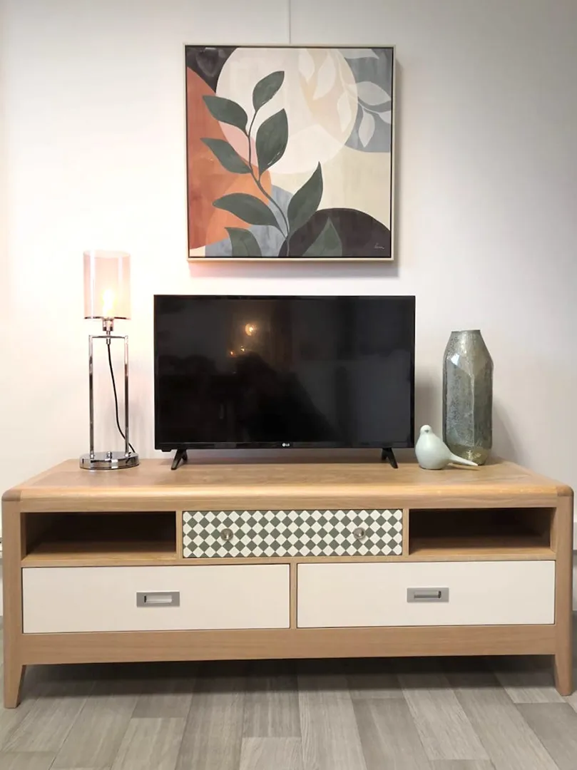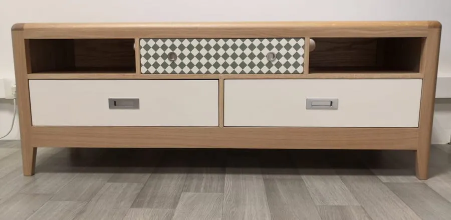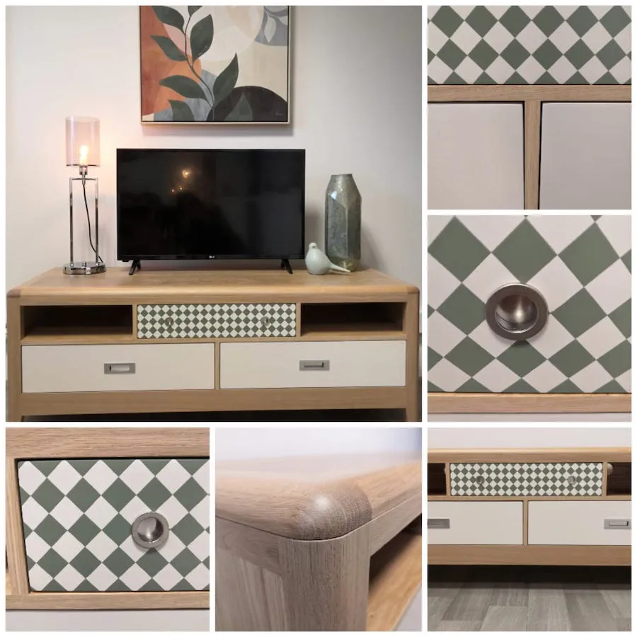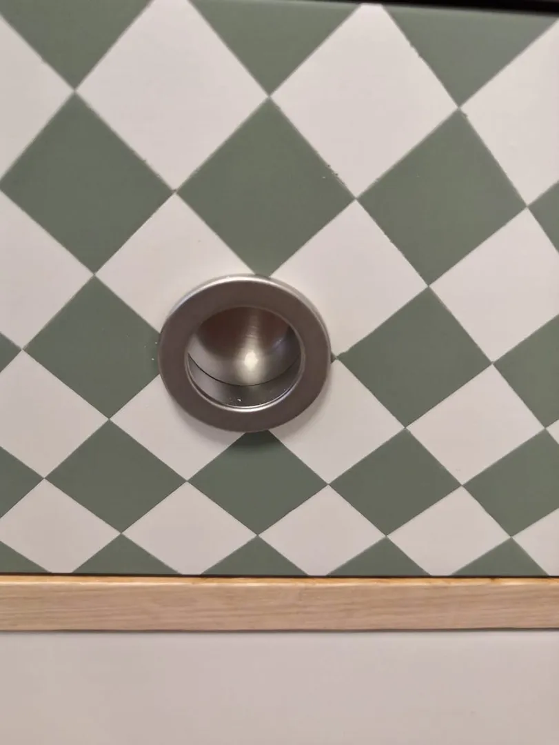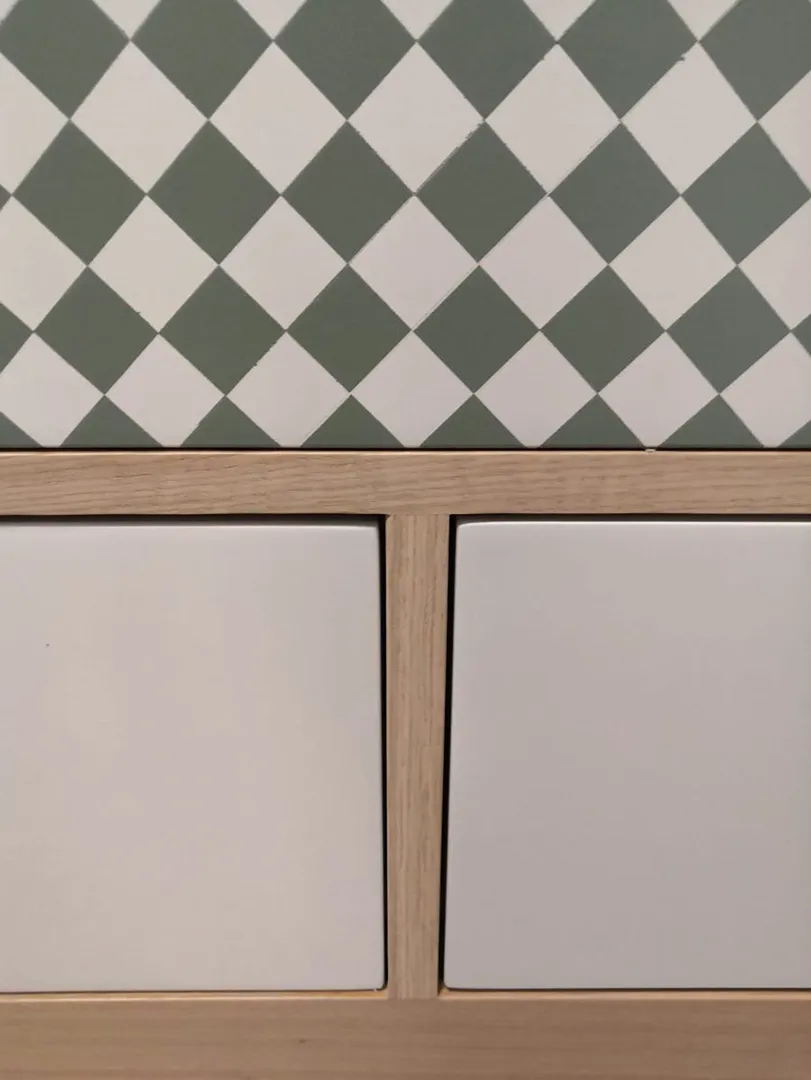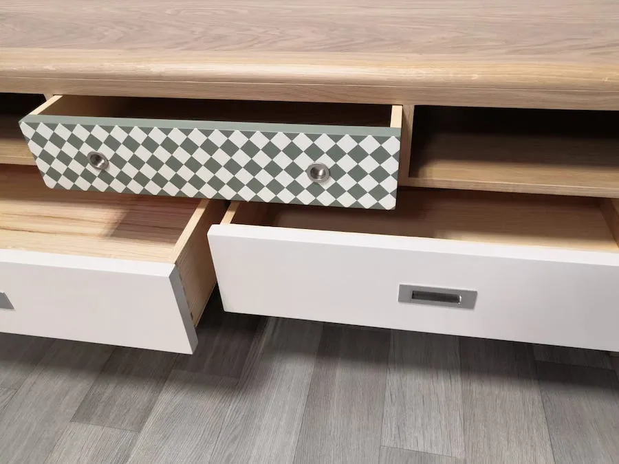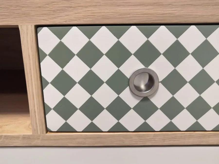 Grands tiroirs « ivoire mate », tiroir haut carrés « sauge » et « ivoire »