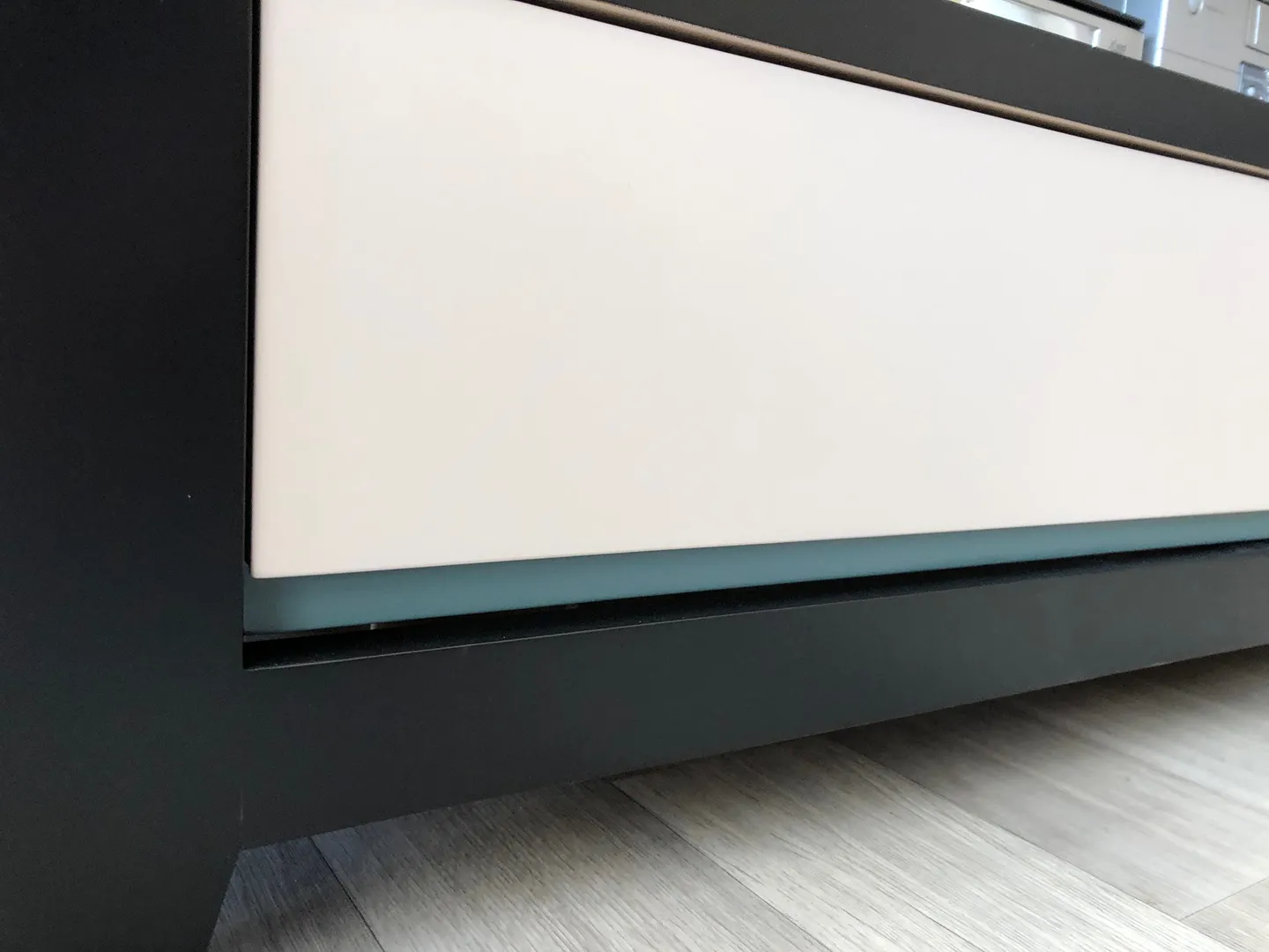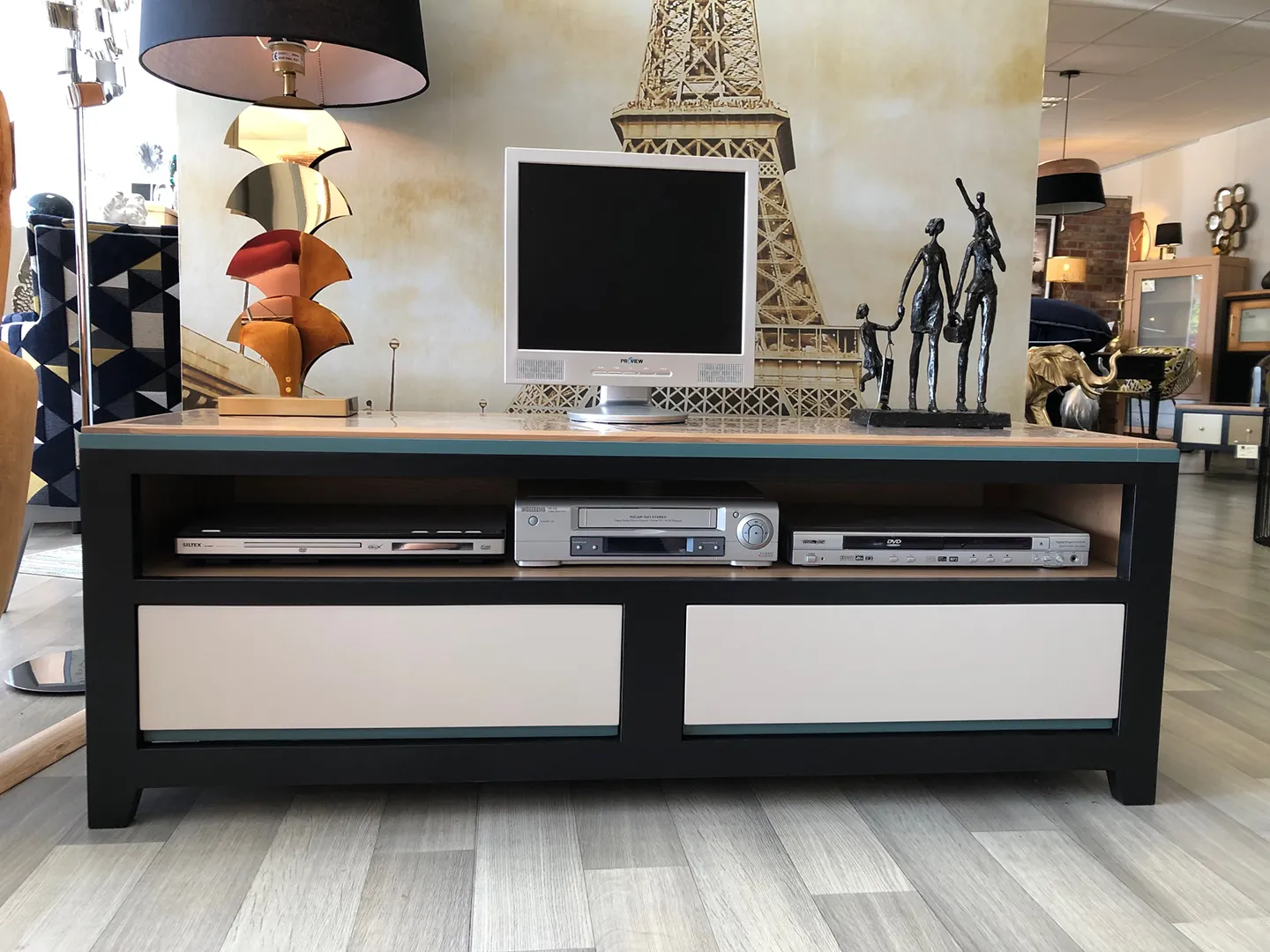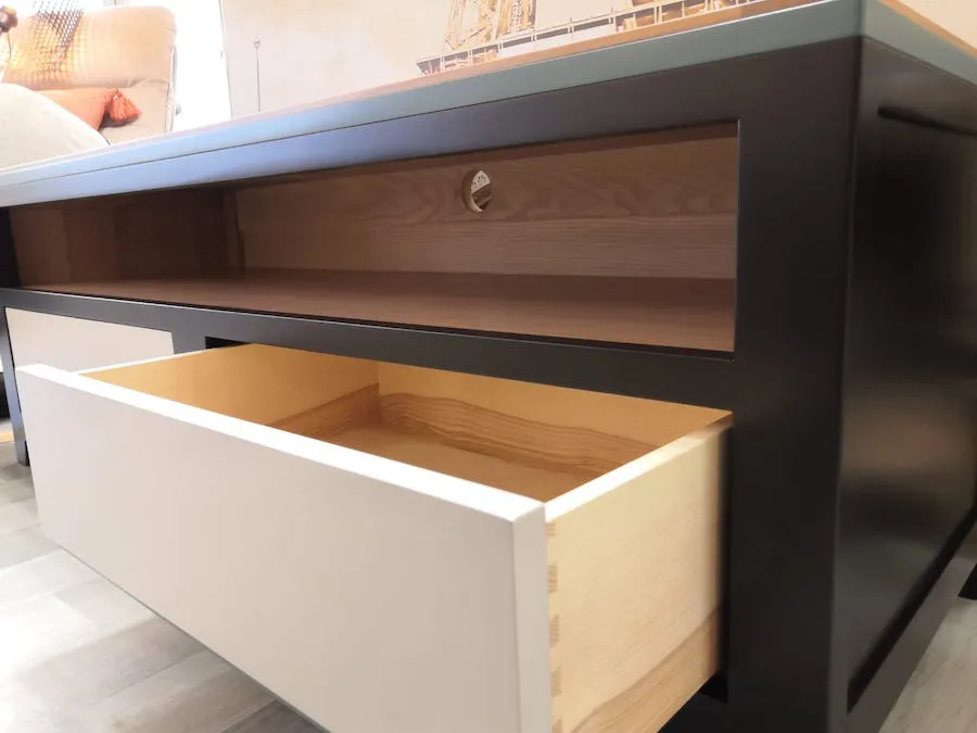 Finition peinte en noir, bordures peintes en « bleu salvia », tiroirs en « gris terreux ».
