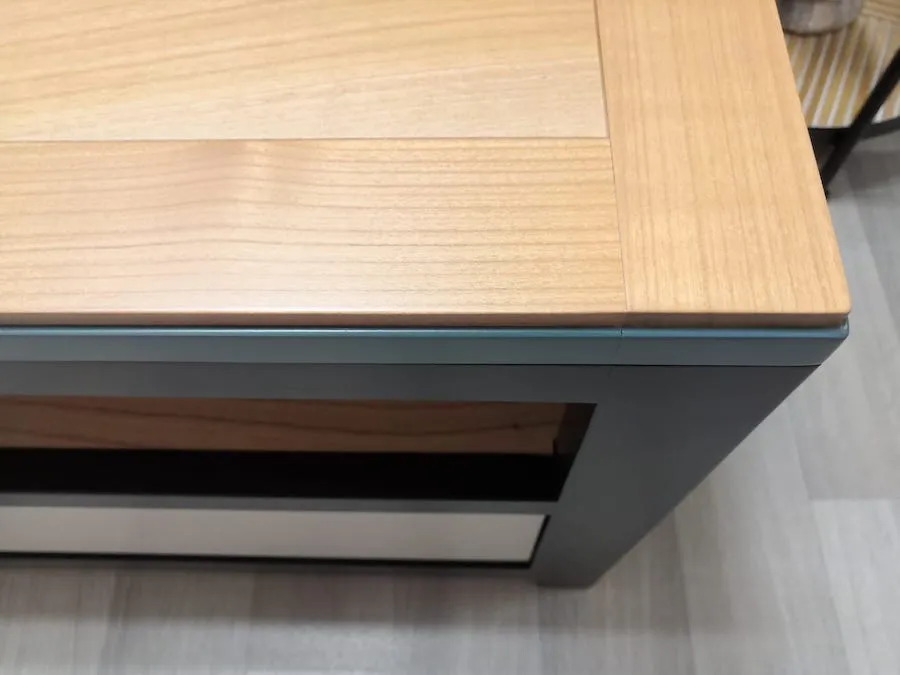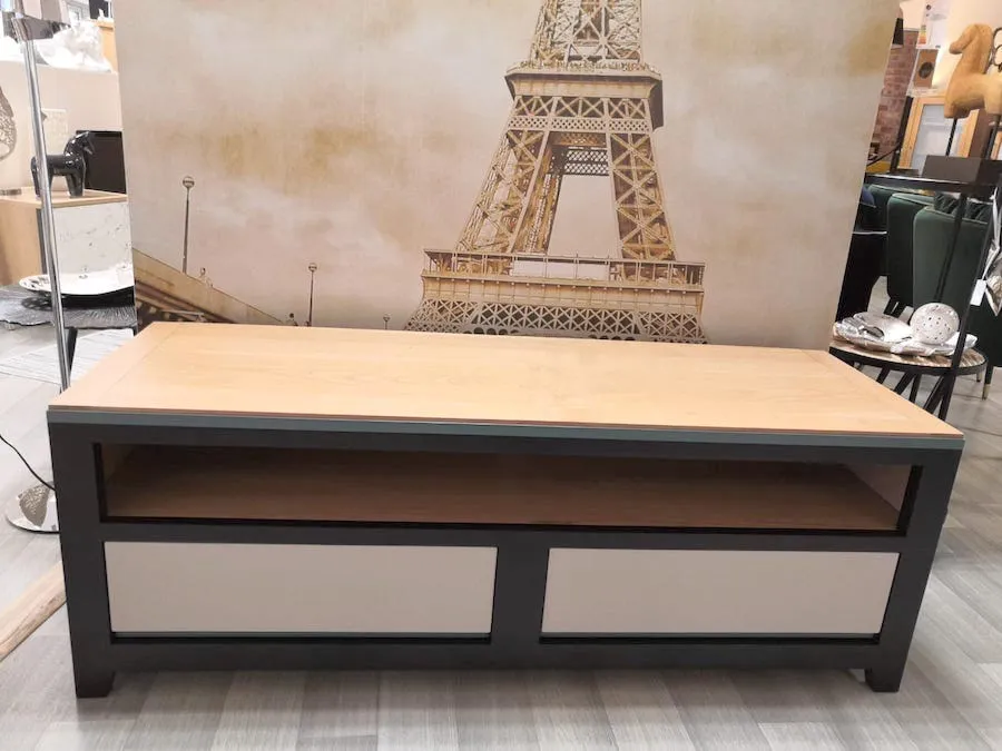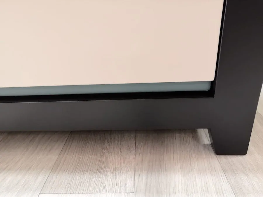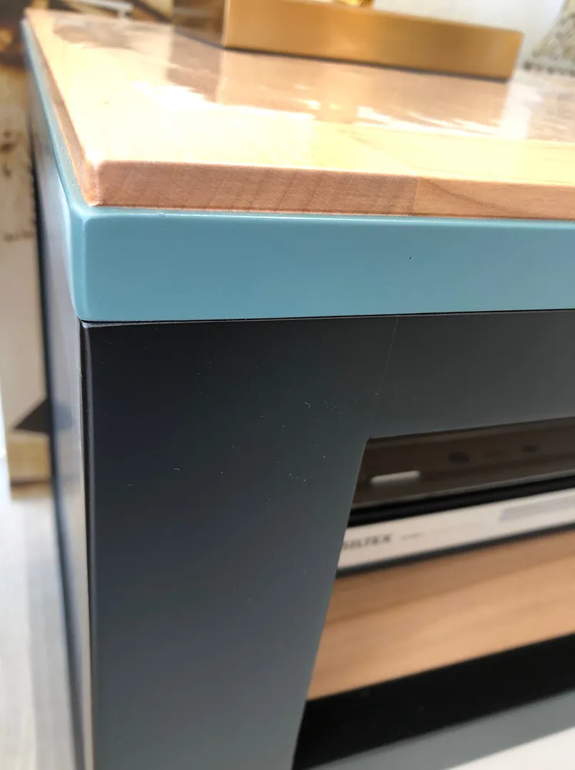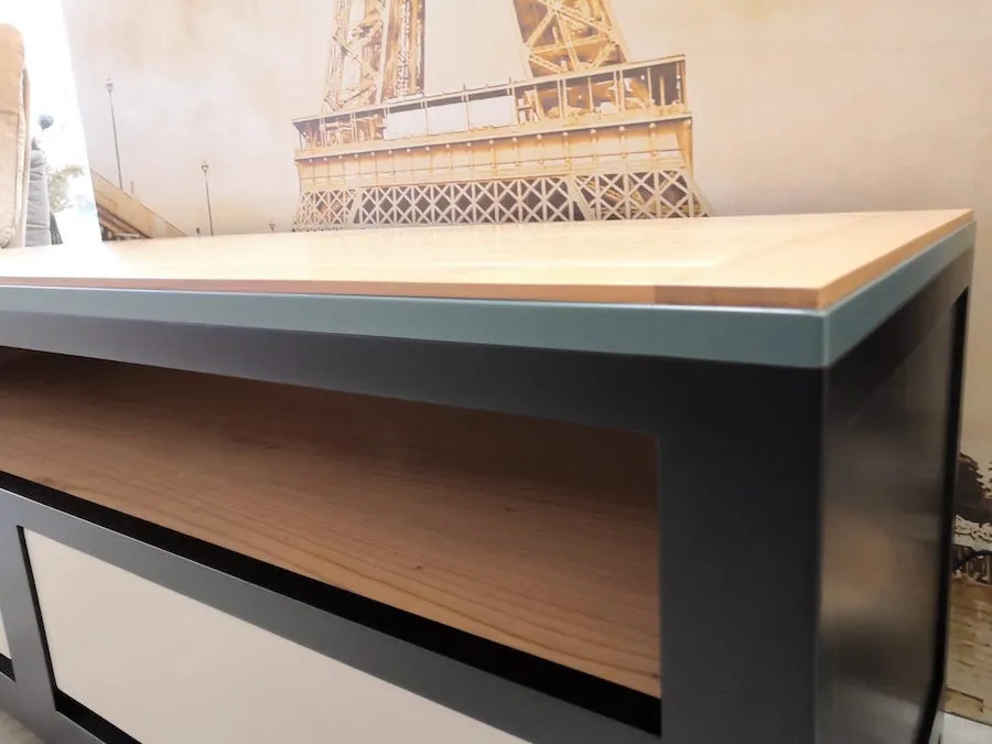 Finition peinte en noir, bordures peintes en « bleu salvia », tiroirs en « gris terreux ».