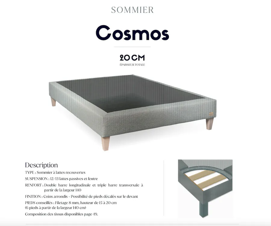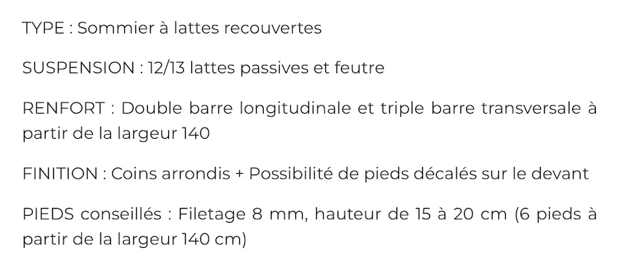 - PIEDS : Barre de pieds décalés. Sommier à équiper de pieds à visser de filetage 8 mm et de 15 à 25 cm de hauteur + 6 pieds à partir de la largeur 140
