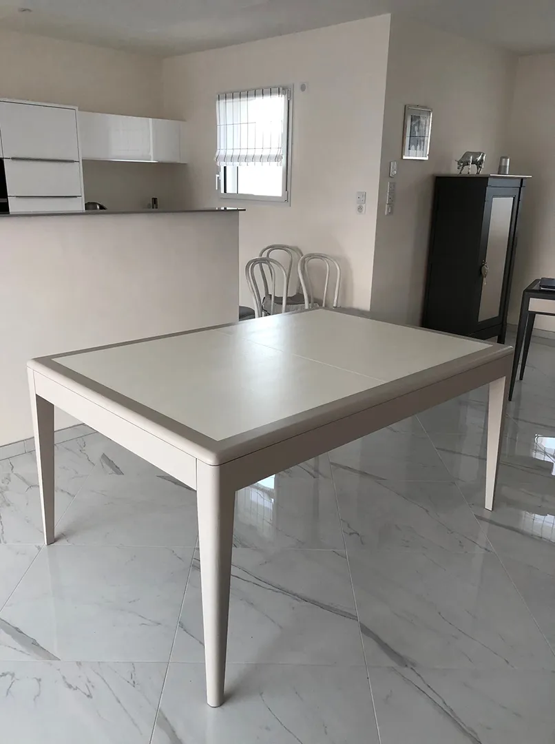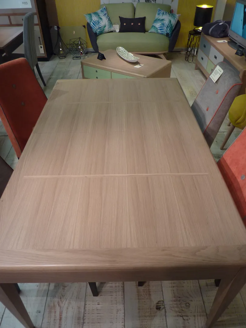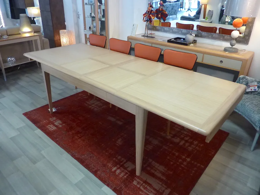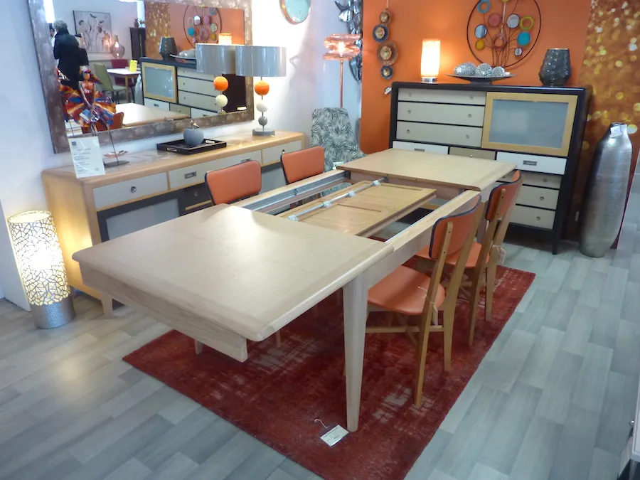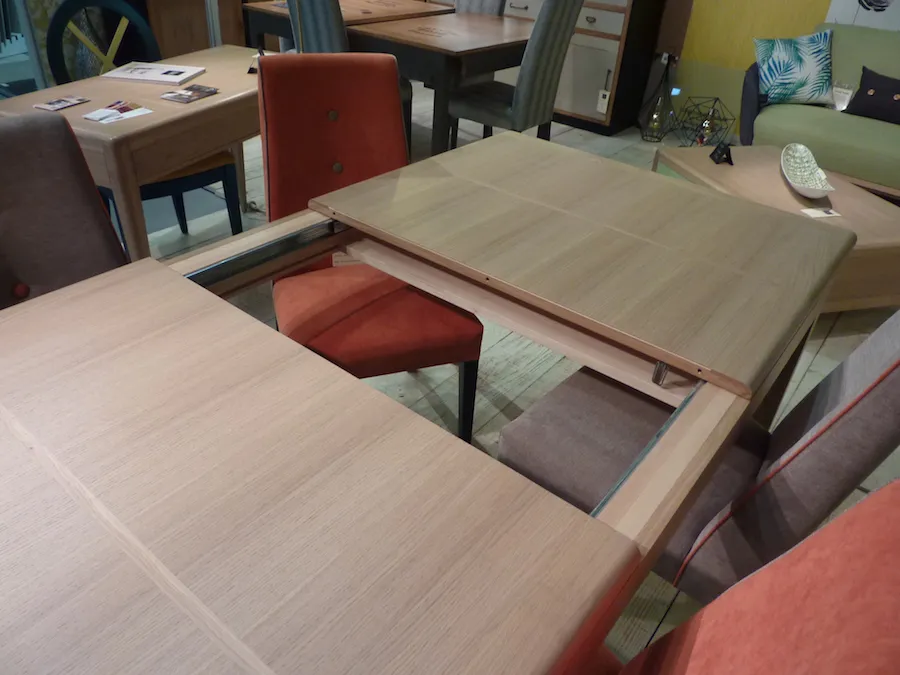 Très fonctionnelle en raison de son système d’ouverture synchronisée et ses 2 allonges rangées sous la table.
