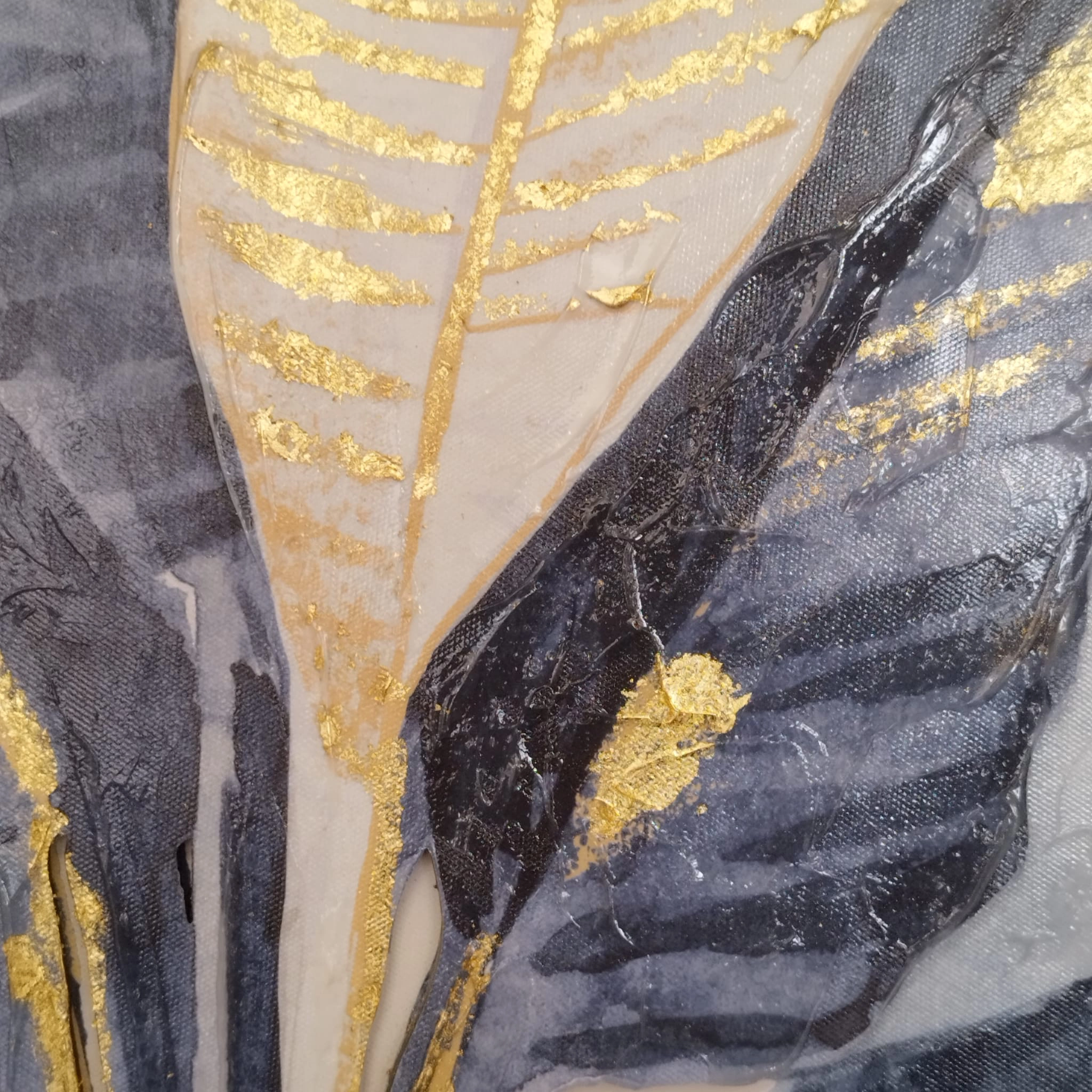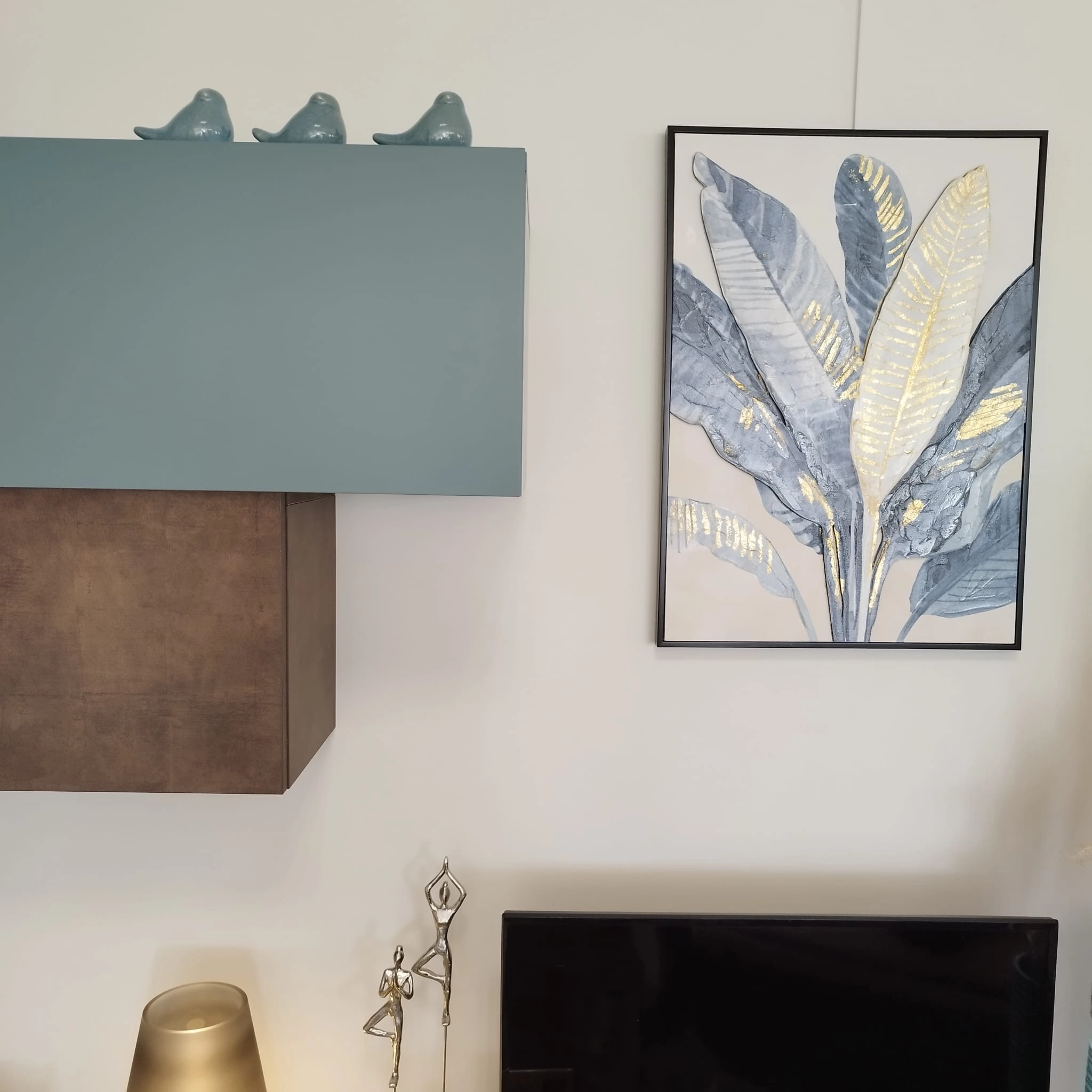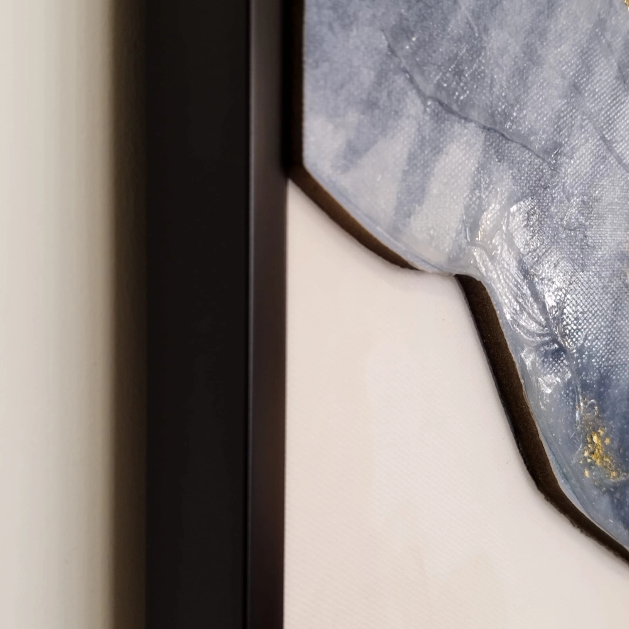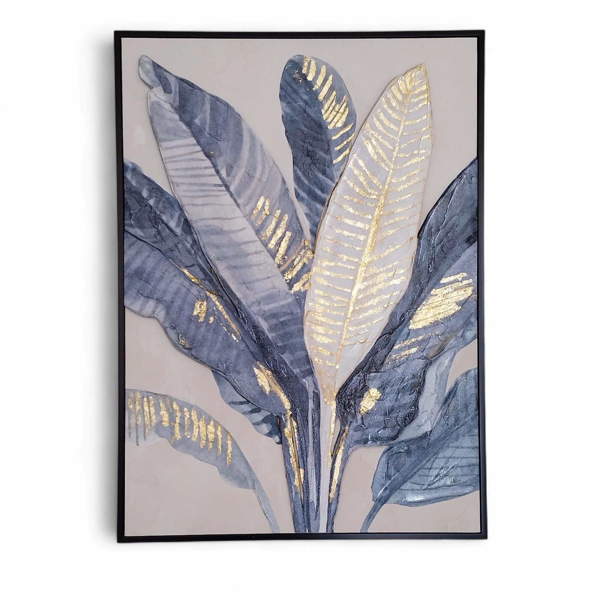 Beau tableau aux tons bleu et doré, avec encadrement.